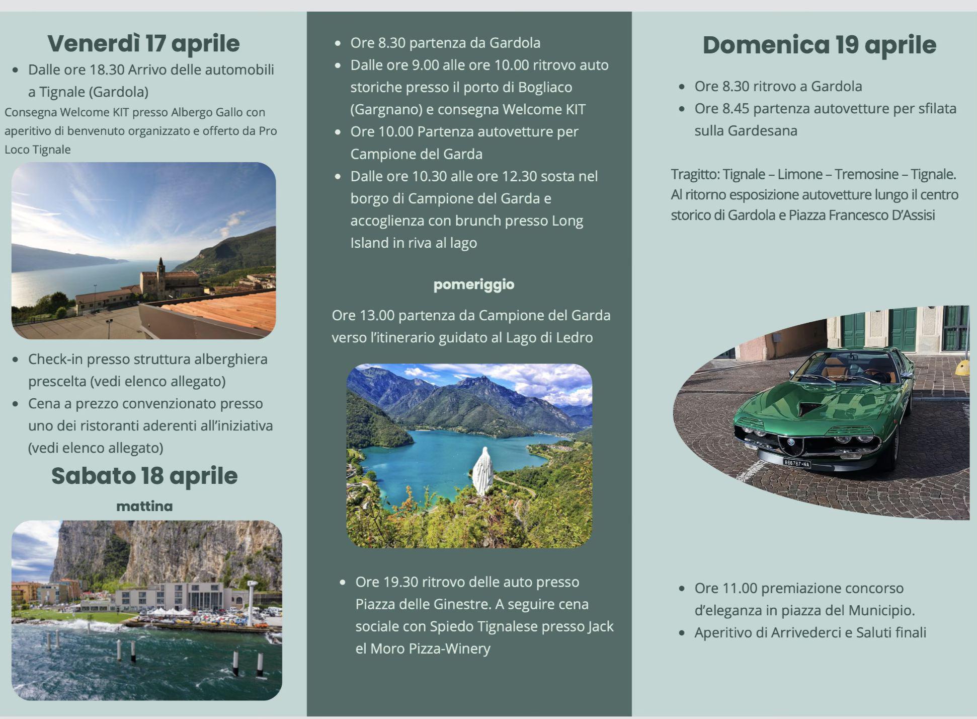 Alla sua seconda edizione, l’iniziativa è riservata alle auto d’epoca ante 1980 e propone un mix coinvolgente di tour guidati tra le strade panoramiche dell’Alto Garda, esperienze enogastronomiche con prodotti tipici del territorio e momenti di intrattenimento e convivialità.