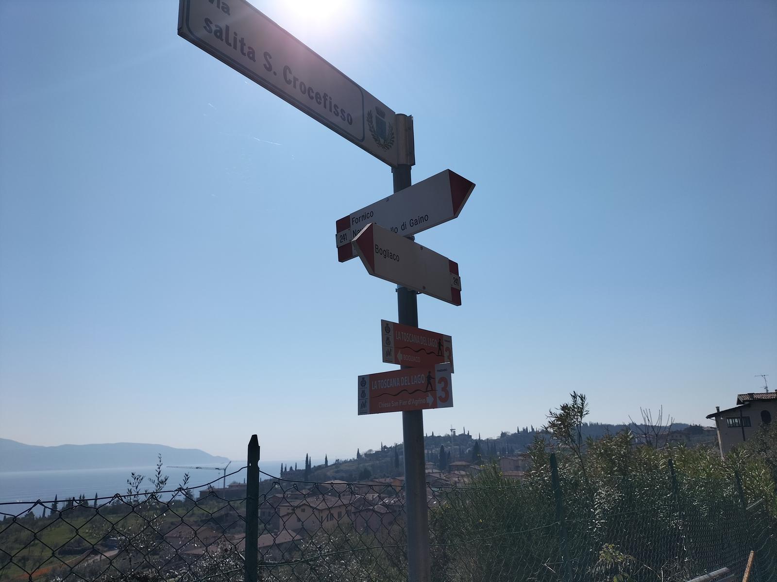 Wie eine toskanische Landschaft mutet uns streckenweise das hügeliges Hinterland von Gargnano an, das sich bis Toscolano erstreckt, mit seinen verstreut liegenden mittelalterlichen Bergdörfern sowie kleinen ländlichen Kirchen und alten Bauernhäusern, mit von Zypressen umgebenen Anhöhen und mit Lorbeer-hecken gesäumten, ausgedehnten Olivenhainen. Eine idyllische Landschaft wie in der Toskana…aber in unserem Fall mit „Bonusprogramm“: atemberaubende Aussichten, die sich zum See hin öffnen! Die Wanderung beginnt an der Weggabelung der Gardesana nach Villa (Ortsteil von Gargnano) neben dem Strandbad „Lido“, wo auch eine Schautafel mit einer Wegekarte den Rundgang beschreibt.