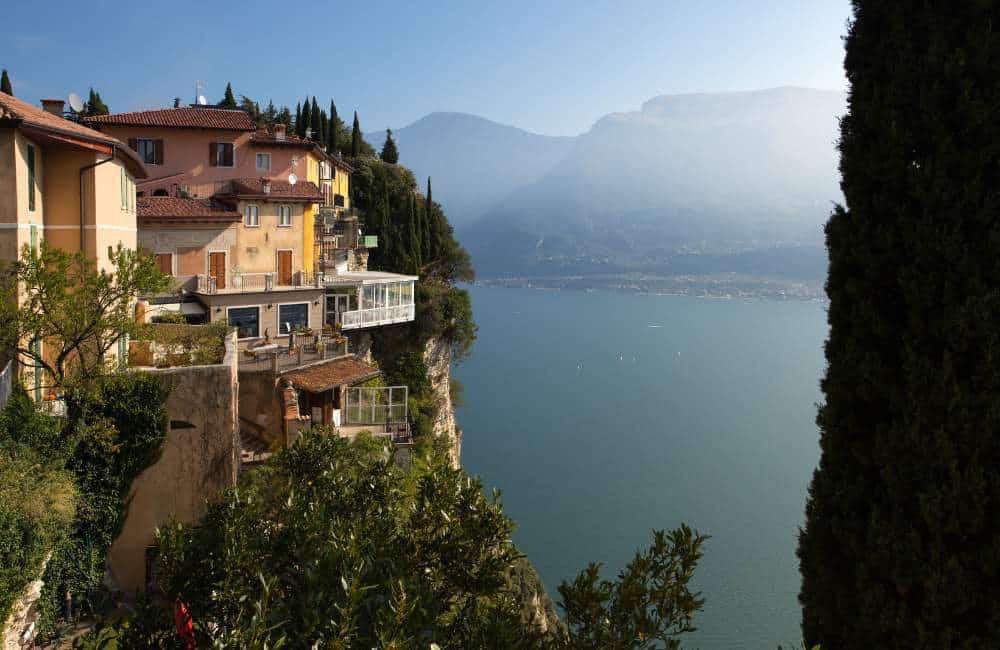 The view stretches across the waters of Lake Garda and the surrounding mountains, offering a unique and unforgettable visual experience.